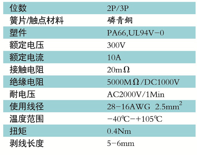 接線端子的絕緣材料用改性的尼龍(PA66),能達到或超過IEC947-7-1EN60947-7-1標準,阻燃等級達到UL94,V-0具有良好的電氣性能和機械性能。螺絲用高強度的鋼制成鍍鋅或鎳處理,導電體四方針用合金銅制成表面鍍錫,壓片采用彈性及極強的磷青銅表面鍍錫或鎳;壓線框用抗應力裂縫腐蝕的合金銅制成,這些金屬表面還鍍錫或鍍鎳加以保護。設計完全符合IEC60947-7-1.GB14048.7等標準。