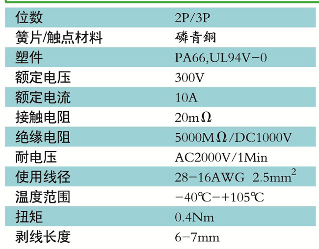 接線端子的絕緣材料用改性的尼龍(PA66),能達到或超過IEC947-7-1EN60947-7-1標準,阻燃等級達到UL94V-0具有良好的電氣性能和機械性能。螺絲用高強度的鋼制成鍍鋅或鎳處理,導電體四方針用合金銅制成表面鍍錫,壓片采用彈性及極強的磷青銅表面鍍錫或鎳;壓線框用抗應力裂縫腐蝕的合金銅制成,這些金屬表面還鍍錫或鍍鎳加以保護。設計完全符合IEC60947-7-1.GB14048.7等標準。