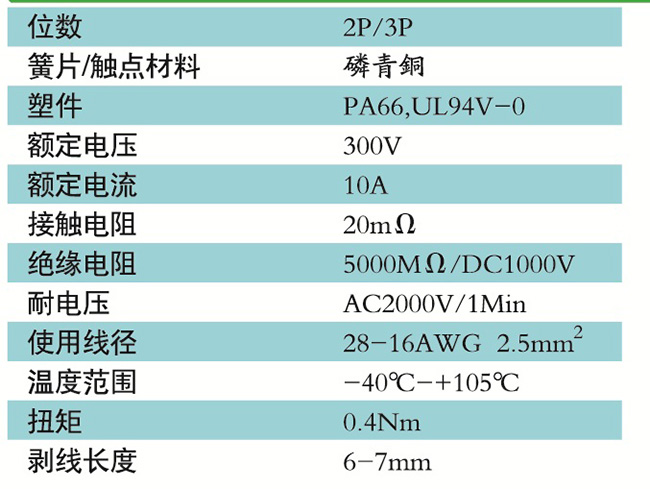 接線端子的絕緣材料用改性的尼龍(PA66),能達到或超過IEC947-7-1及EN60947-7-1標準,阻燃等級達到UL94,V-0具有良好的電氣性能和機械性能。螺絲用高強度的鋼制成鍍鋅或鎳處理,導電體四方針用合金銅制成表面鍍錫,壓片采用彈性及極強的磷青銅表面鍍錫或鎳;壓線框用抗應力裂縫腐蝕的合金銅制成,這些金屬表面還鍍錫或鍍鎳加以保護。設計完全符合IEC60947-7-1.GB14048.7等標準。