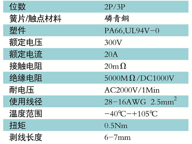 接線端子的絕緣材料用改性的尼龍(PA66),能達到或超過IEC947-7-1EN60947-7-1標準,阻燃等級達到UL94V-0具有良好的電氣性能和機械性能。螺絲用高強度的鋼制成鍍鋅或鎳處理,導電體四方針用合金銅制成表面鍍錫,壓片采用彈性及極強的磷青銅表面鍍錫或鎳;壓線框用抗應力裂縫腐蝕的合金銅制成,這些金屬表面還鍍錫或鍍鎳加以保護。設計完全符合IEC60947-7-1.GB14048.7等標準。