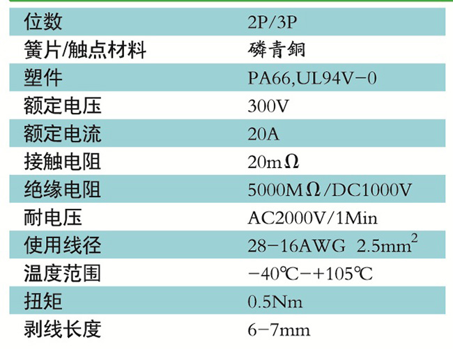 接線端子的絕緣材料用改性的尼龍(PA66),能達到或超過IEC947-7-1EN60947-7-1標準,阻燃等級達到UL94V-0具有良好的電氣性能和機械性能。螺絲用高強度的鋼制成鍍鋅或鎳處理,導電體四方針用合金銅制成表面鍍錫,壓片采用彈性及極強的磷青銅表面鍍錫或鎳;壓線框用抗應力裂縫腐蝕的合金銅制成,這些金屬表面還鍍錫或鍍鎳加以保護。設計完全符合IEC60947-7-1.GB14048.7等標準。